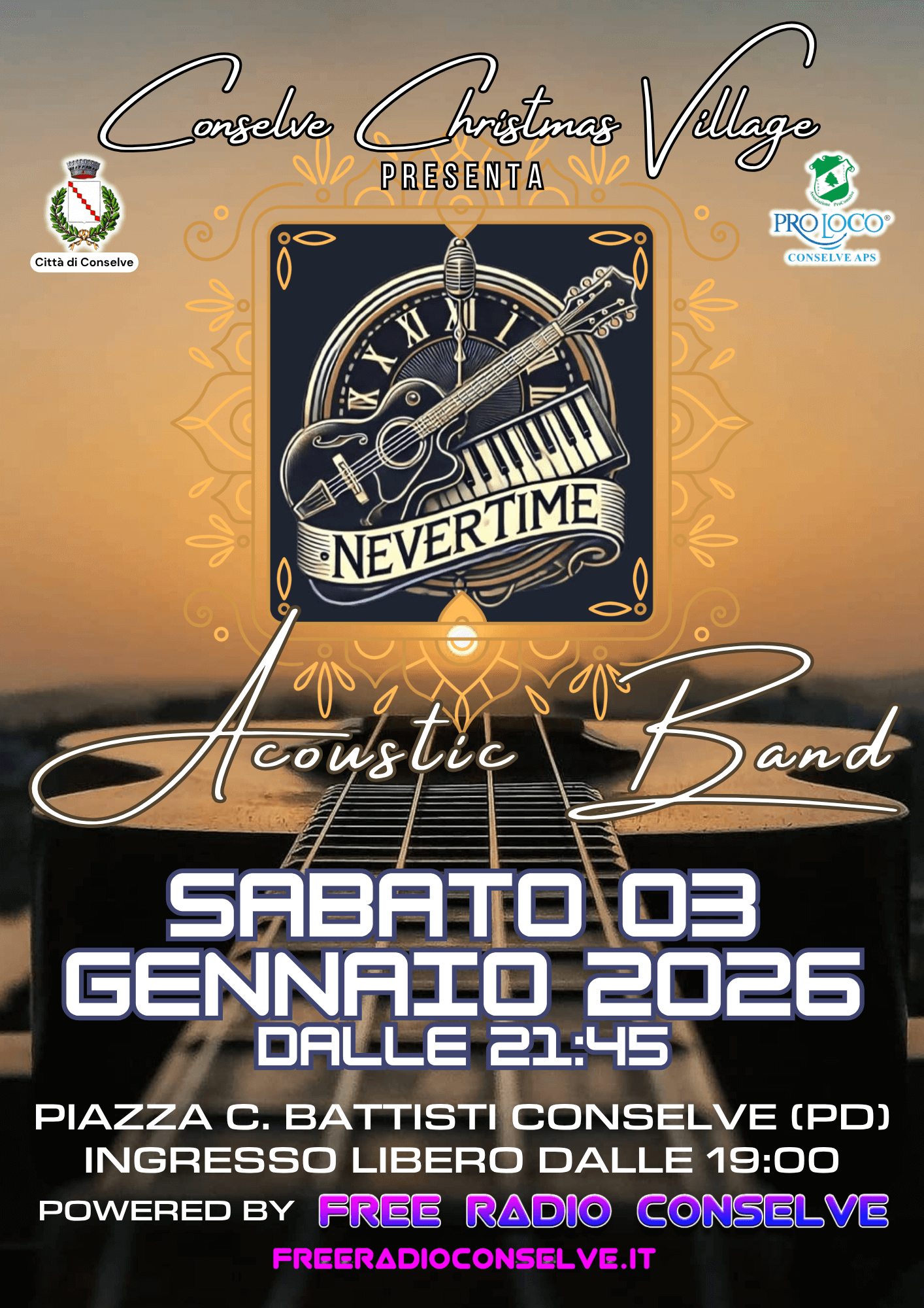 SAB 3-1-26 - Nevertime progetto ambizioso con l'intento di rivisitare in chiave semiacustica i brani più famosi di gruppi iconici quali Beatles, Rolling Stones, Pink Floyd, U2, Eagles, Radiohead, Coldplay ecc... Francesco (tastiere), Marco (chitarra elettrica, voce), Stefano (chitarra acustica, voce), Ambra (violino, percussioni), Damiano (voce), Alexandra (voce).
